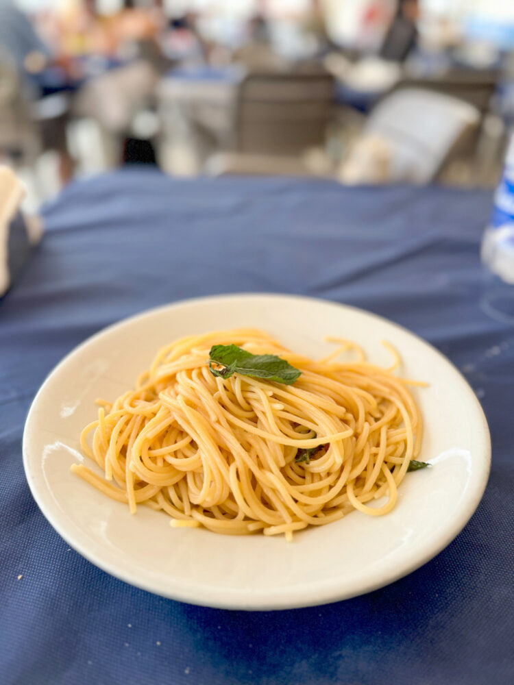 - If you didn’t book ahead (like me), don’t worry – I ended up at Il Pescatore and loved it. It’s right on the harbor, with views of the fishing boats and a breezy, relaxed vibe. The spaghetti al limone blew me away (my new favorite pasta dish), and their refreshing lemon salad – their specialty – was just what I needed.
