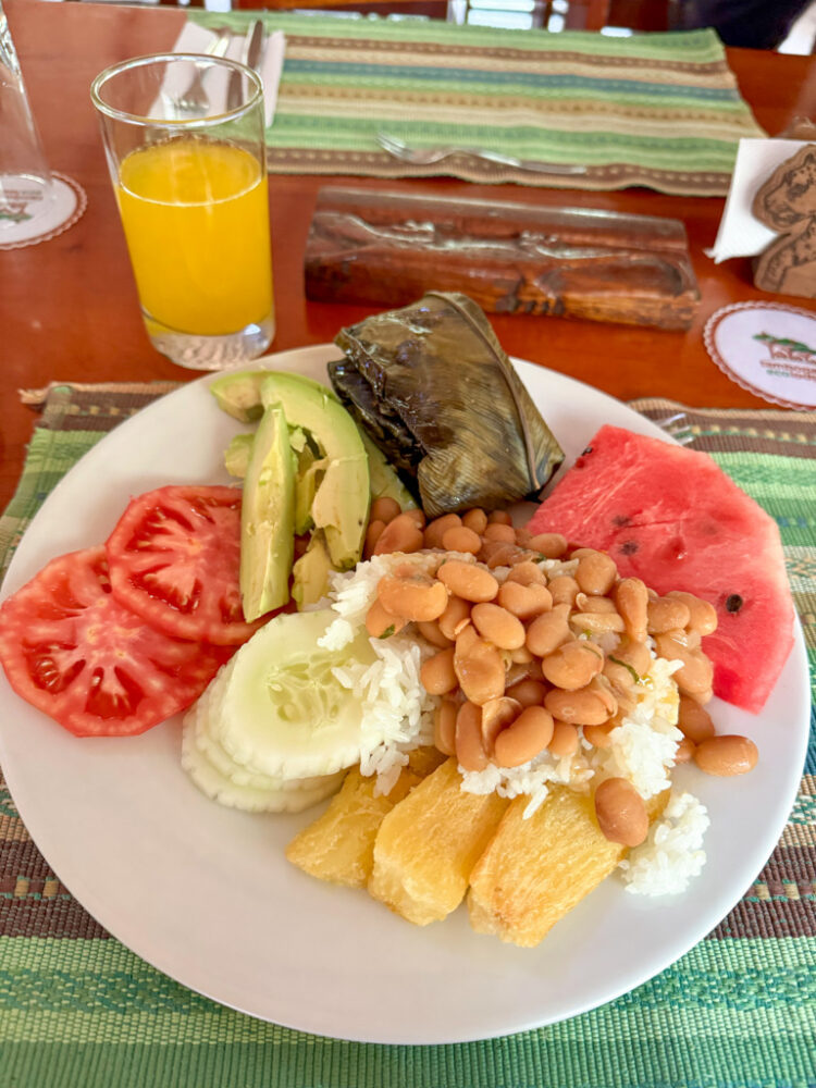 Some standout dishes? Fried plantains, yucca, black beans, and tender chicken wrapped in banana leaves. We also had pork with a rich curry sauce, creamy avocado, fresh tropical fruit, and even dessert every night (the passionfruit flan and pie de manzana were amazing!). Breakfasts were simple but hearty, with fried eggs, fresh fruit juices, and more carbs to fuel the day ahead.