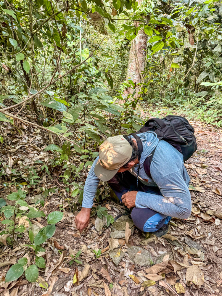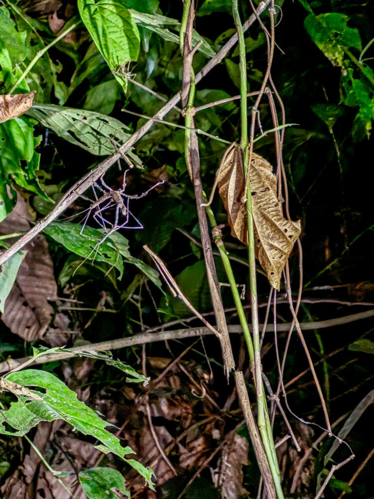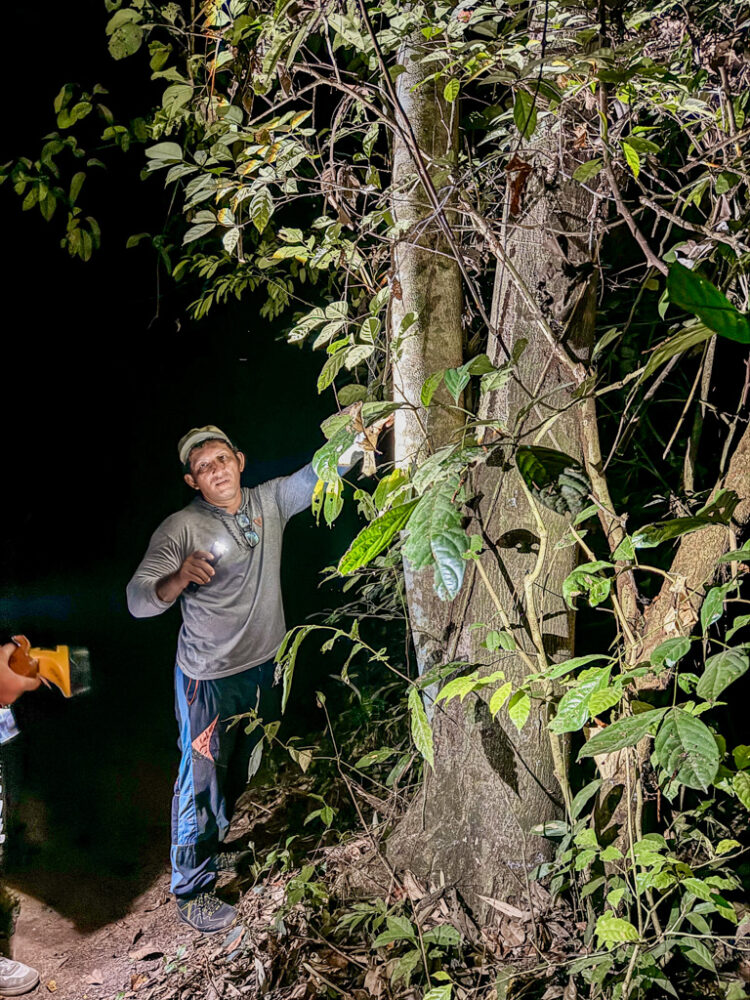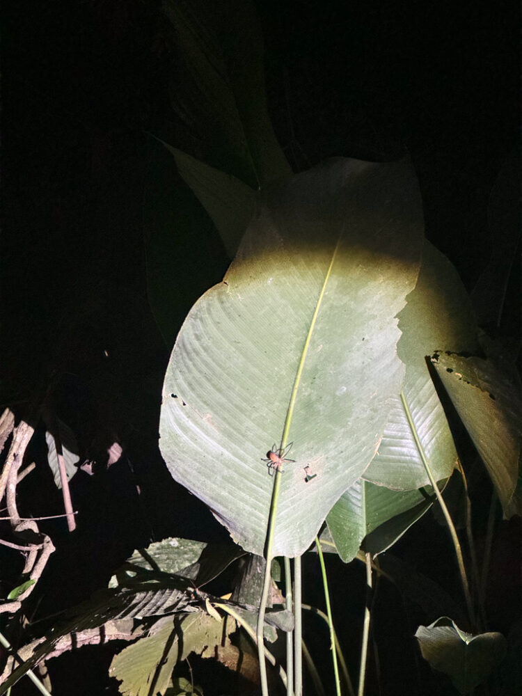 Exploring the Amazon after dark is a whole different experience. With flashlights in hand, we followed our guide into the pitch-black jungle where we spotted massive spiders (including tarantulas and the infamous “chicken spider”), stick bugs camouflaged against branches, Amazon bamboo rats darting through the undergrowth, and endless trails of bullet ants and army ants. It’s kinda wild because you initially don’t see anything at all, and you need to look super closely.