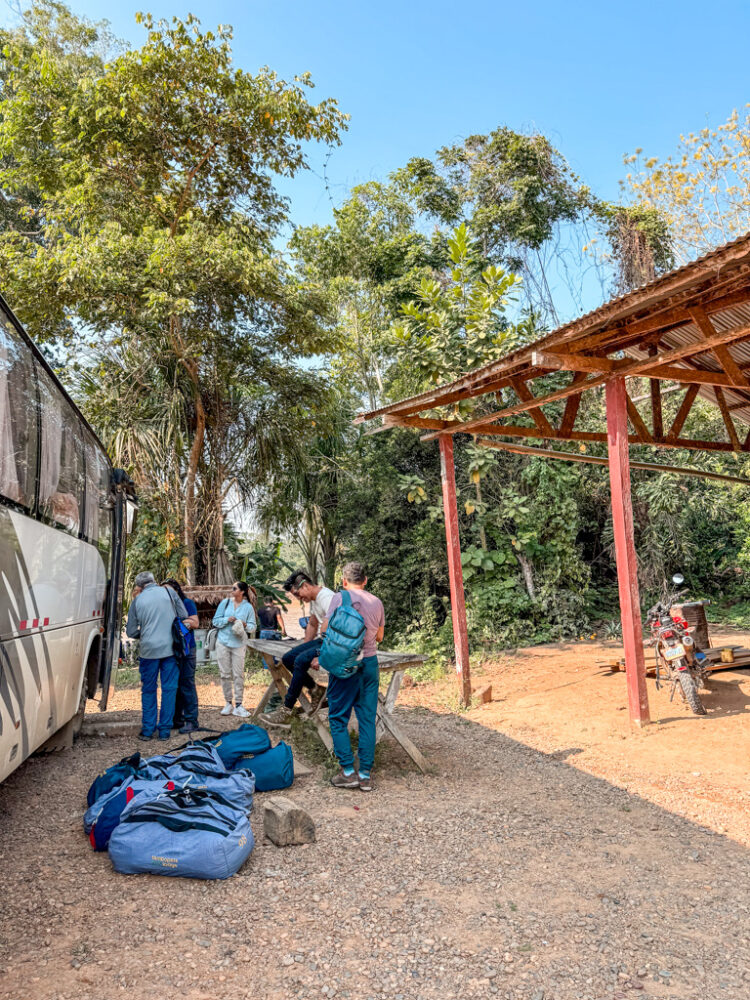 Once everyone’s packed and ready, it’s time for a 30 to 45-minute drive on a bumpy dirt road to the river port. The ride itself is a bit of an adventure – we passed through thick jungle, small villages, and the occasional roadside stand selling fresh coconuts. Keep your eyes peeled for wildlife; we unfortunately didn’t see anything just yet.