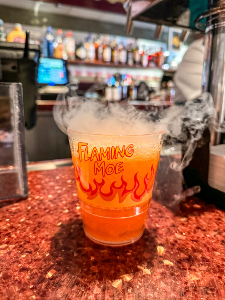 - Flaming Moe: 5/10 (get solely for the presentation – it’s just orange soda with dry ice)